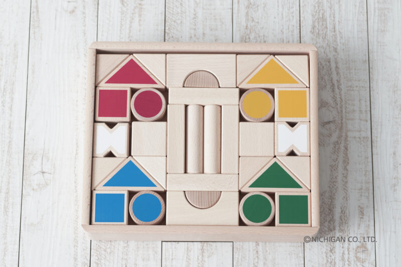 赤・黄・緑・青、丸・三角・四角、基本の「色・形」にふれることが出来る日本製のベーシックなつみきセットです。
